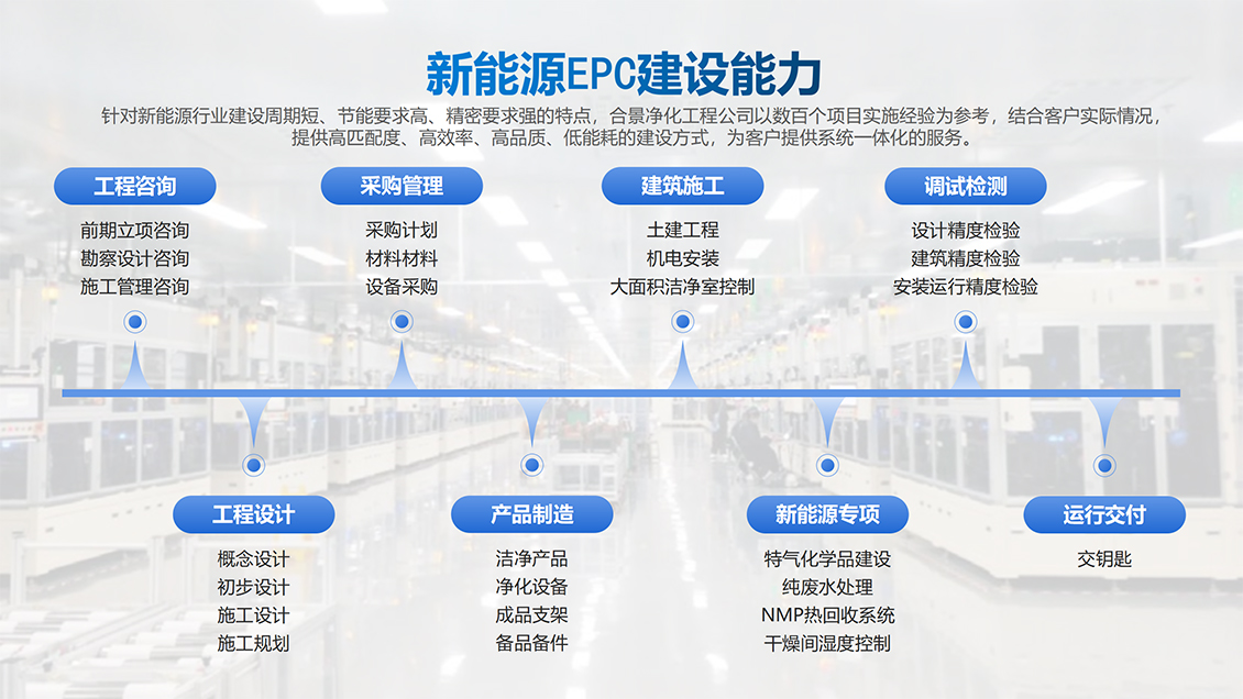 合景智慧建設(shè)是工業(yè)高端制造領(lǐng)域生產(chǎn)車間建設(shè)高潔凈度和低露點(diǎn)凈化車間內(nèi)裝工程的規(guī)劃、設(shè)計、采購、施工與服務(wù)一體化總承包商,多年來,在大型廠房建設(shè)方面積累了大量豐富的低凈化車間內(nèi)裝工程設(shè)計和施工經(jīng)驗(yàn),特別是在產(chǎn)能規(guī)劃、公用工程、環(huán)境工程(溫度、低露點(diǎn)、高潔凈度)等領(lǐng)域的制造、工藝流程、節(jié)能環(huán)保等提供完善的系統(tǒng)集成工程建設(shè)解決方案。